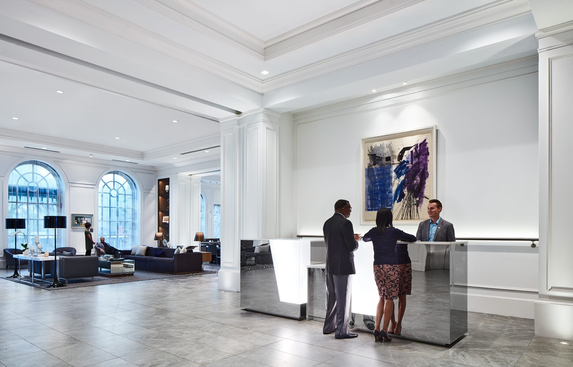 A lobby, breakfast room, and bar occupy the hotel’s ground floor. The three spaces feature traditional raised paneling, contemporary furnishings coordinated by DMSAS, and a rotating selection of midcentury artworks from the client’s collection. Additional amenities include 2,500 SF of flexible meeting space, a fitness center, and administrative offices on the second floor; and a rooftop restaurant.