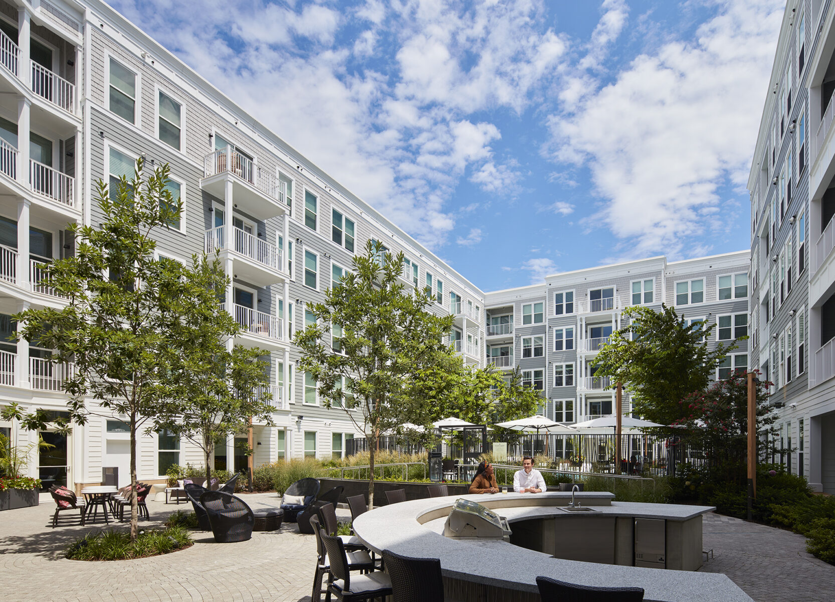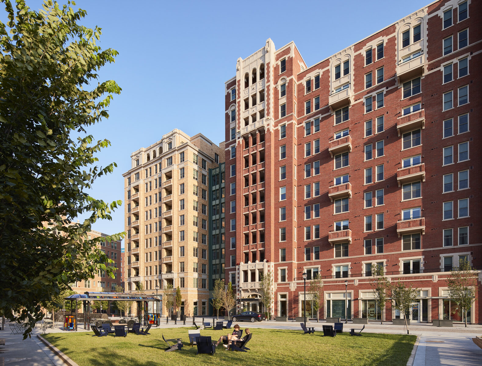 Key buildings include The Barrett, a 6-story apartment building which anchors the project’s entry; The Claude, an 11-story apartment building with a public stair connecting to the light rail station; and The Ritz-Carlton Residences, a 65-unit luxury condominium. At the heart of the development is a curbless neighborhood square designed as a pedestrian-friendly hub for community events. It features green space, a water feature, and an artistic sculpture by Tom Fruin. All three buildings feature ground level retail and restaurant uses.