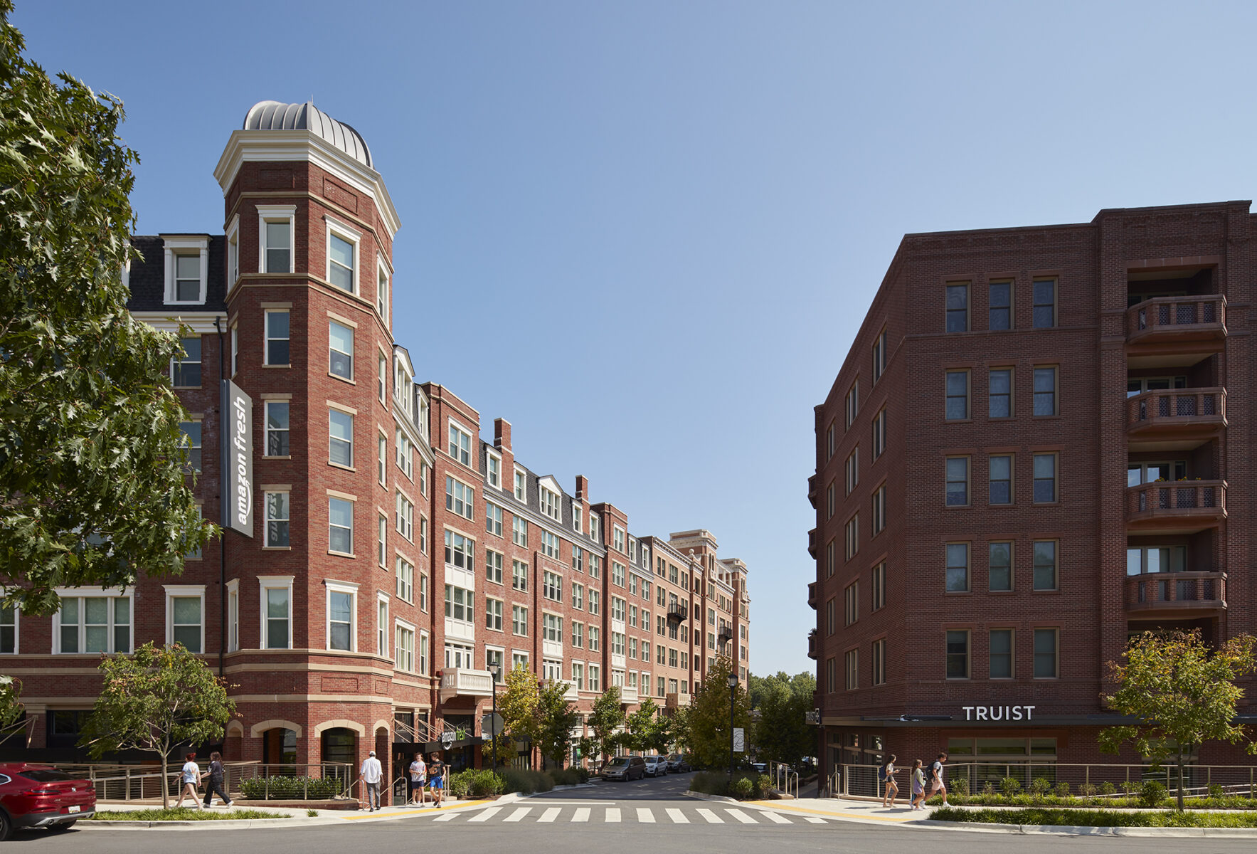 Chevy Chase Lake is a mixed-use development located along a new suburb-to-suburb light rail line just outside Washington, DC. Completed between April 2018 and October 2022, the project replaced a single-story auto-oriented commercial strip mall with three distinct pedestrian-oriented buildings featuring 531 residential units, 110,000 square feet of retail, a one-acre neighborhood square, and three levels of underground parking.