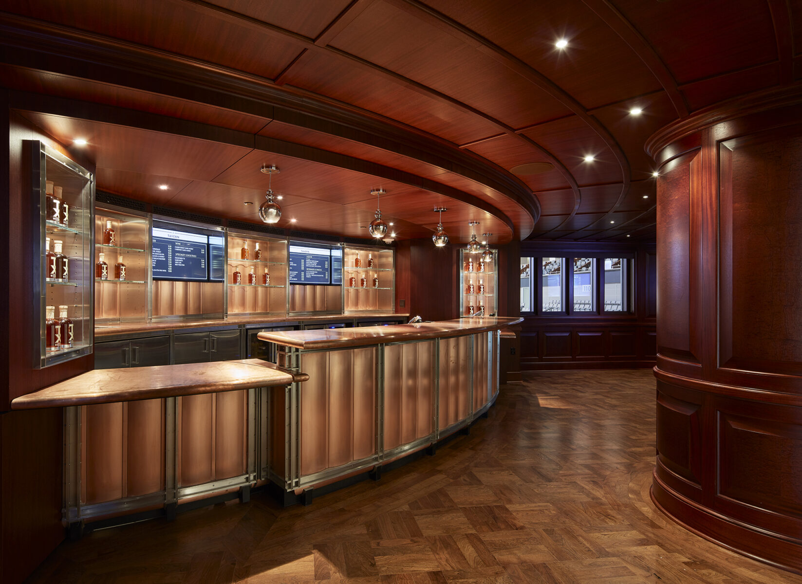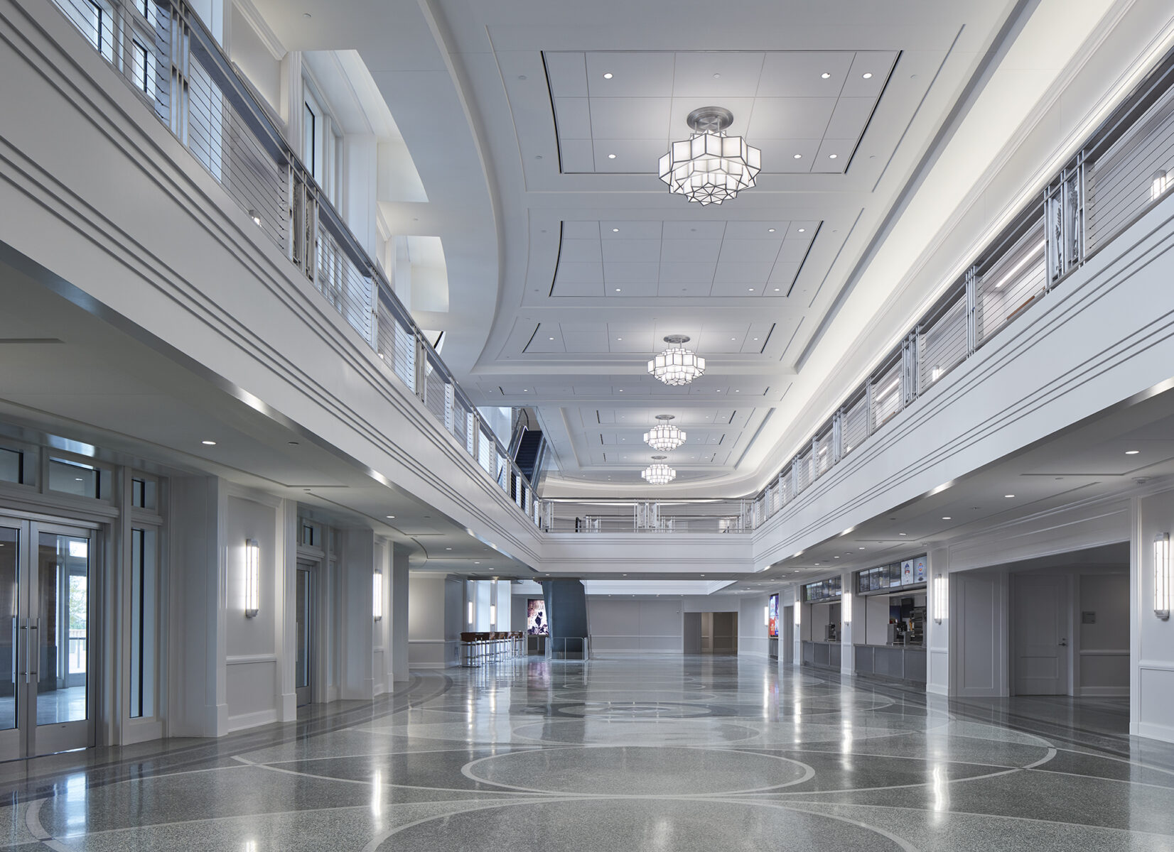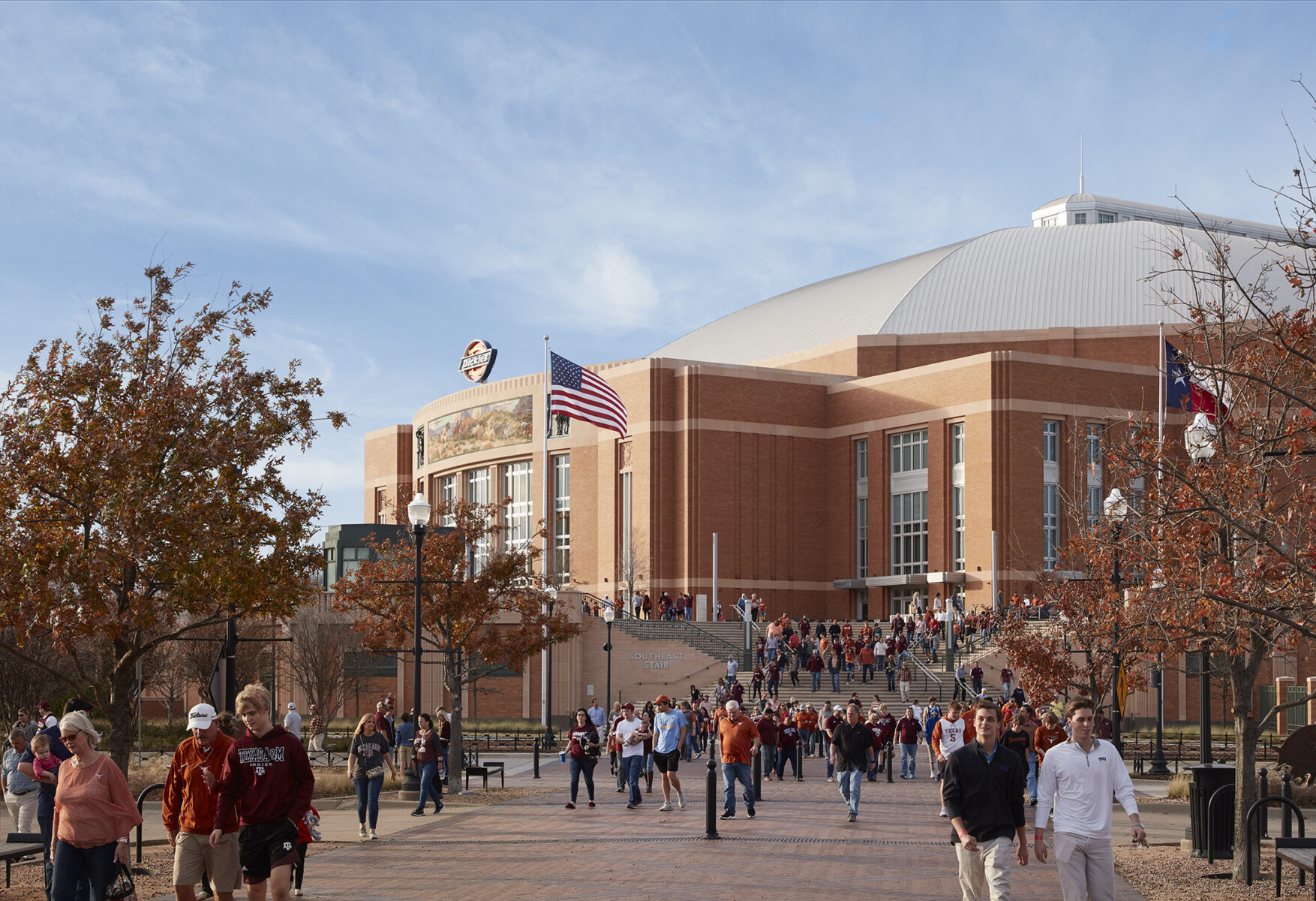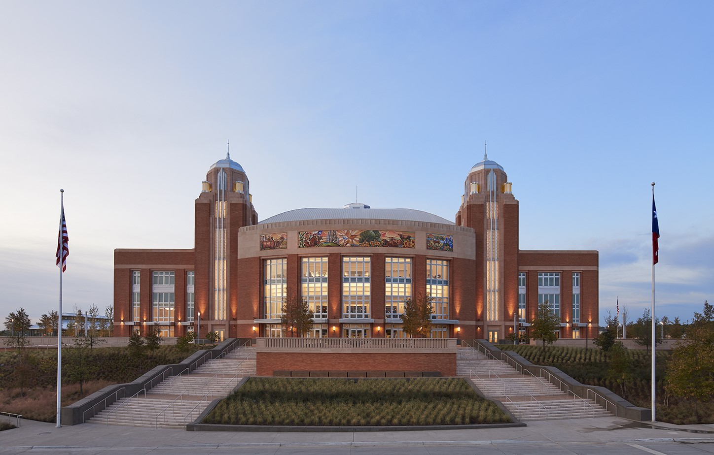 The Dickies Arena’s facades incorporate Southwest Art Deco elements, chosen to relate the building to the 1930s era buildings on the Will Roger’s campus. The primary materials – brick and stone – are complimented with tile mosaics and metal grille work incorporating Fort Worth iconography around the building. The seating bowl is capped off with a cupola that is lit from within.