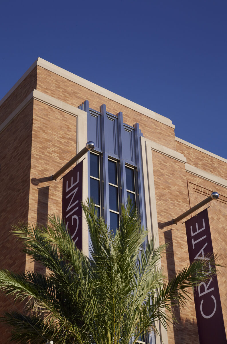 The museum’s massing, fenestration and exterior details are designed with intentionally similarities to those of Reynolds Hall and Boman Pavilion as the museum forms the southern boundary of The Smith Center’s courtyard. Deco detailing tops cast-stone banding around the building’s base, visually connecting the Museum to Boman Pavilion to the north. Playfully patterned brick work surrounds the building’s signature glass opening above the primary entrance. The expansive glass allows ample natural light into the space while also giving passers-by a preview of the whimsical exhibits inside.