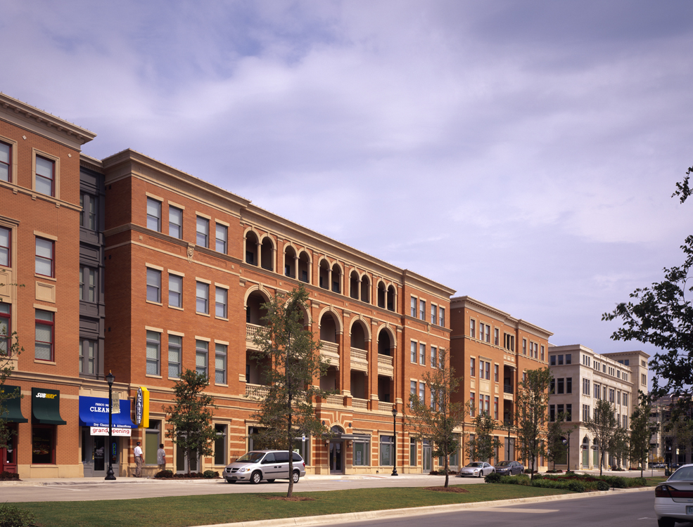 The Commercial District is comprised of the blocks and streets that surround Main Street. The office and retail buildings within the commercial district are all designed as four-story structures with predominantly office space on the upper floors, and shops and restaurants at street level. Many buildings in the Commercial District will initially contain residential uses, which are convertible to office space at a later date. The Commercial District has the civic square at its heart. The civic square, which functions as both a formal town park and a place to host community events, is anchored by City Hall and creates a focus for the entire master plan. It is surrounded on three sides by a retail arcade, which will provide protection and relief from inclement weather and the harsh Texas sun.