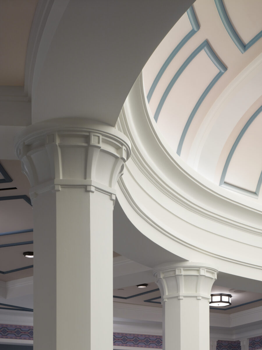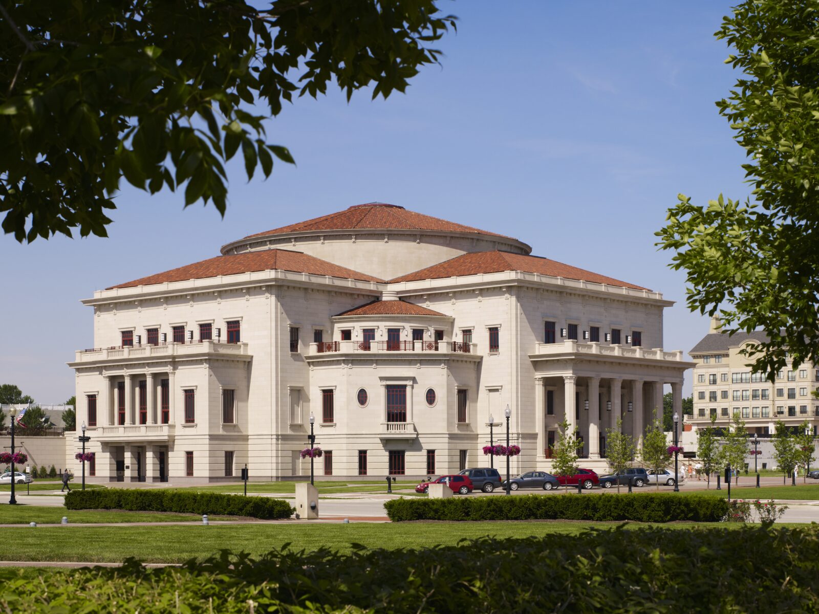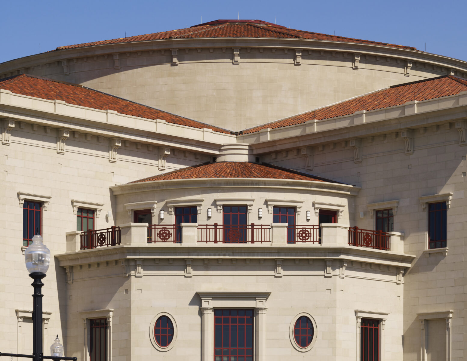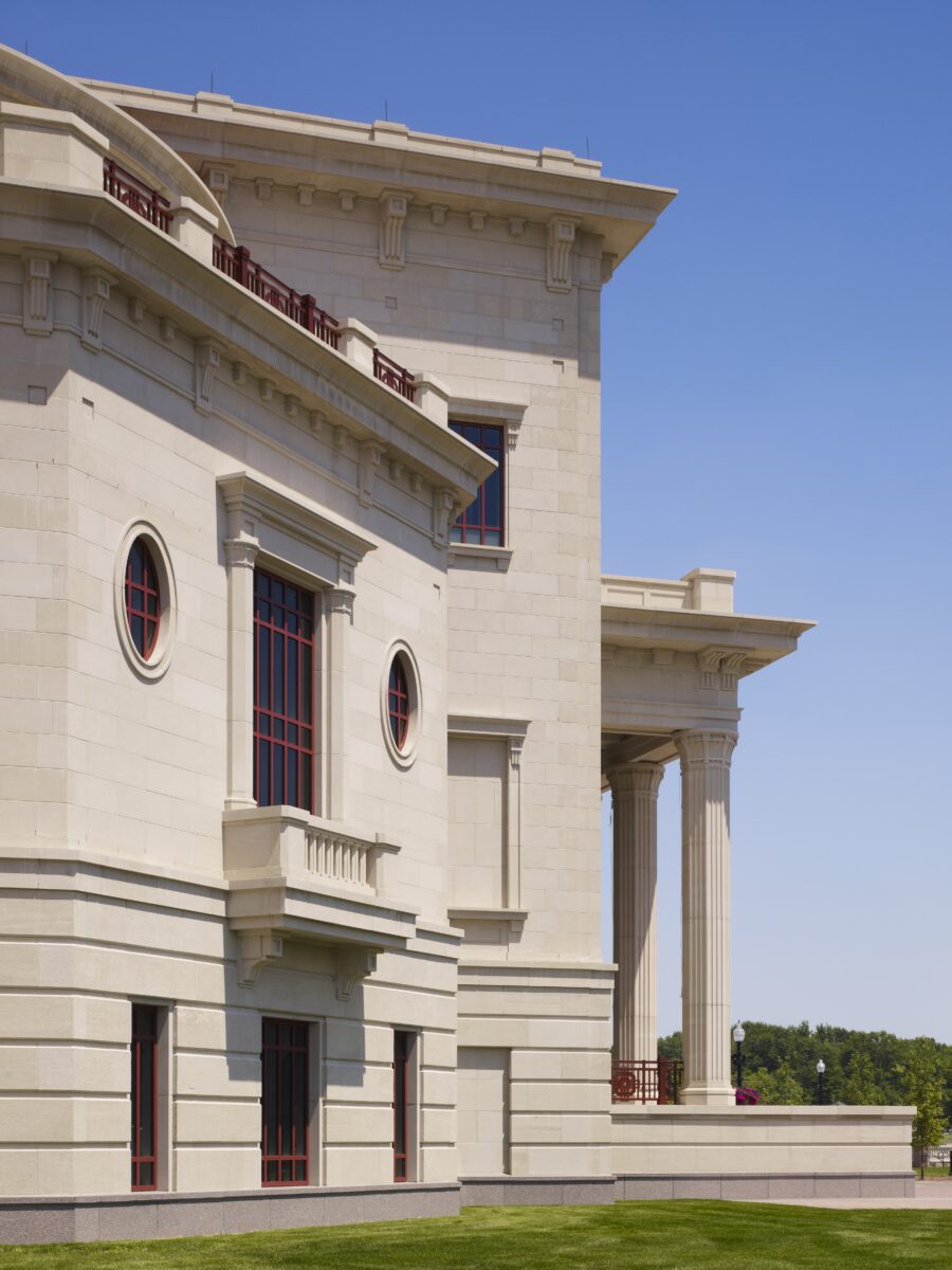 The building is centrally planned with four equally weighted wings projecting from a central domed rotunda in order to respond equally to important neighboring development. Major entrances are incorporated into the south, east and west wings. The east and west entrances are outfitted with recessed covered porches at grade level: the east side faces the site for a future hotel and conference center and the Monon Trail, a popular rails to trails bike and pedestrian path; the west side faces 3rd Avenue and a plaza that serves as a vehicular drop off for events. The portico on the north side has architectural treatment equal to the other three, but does not have an entrance as it is built into a steep embankment facing City Center Drive.