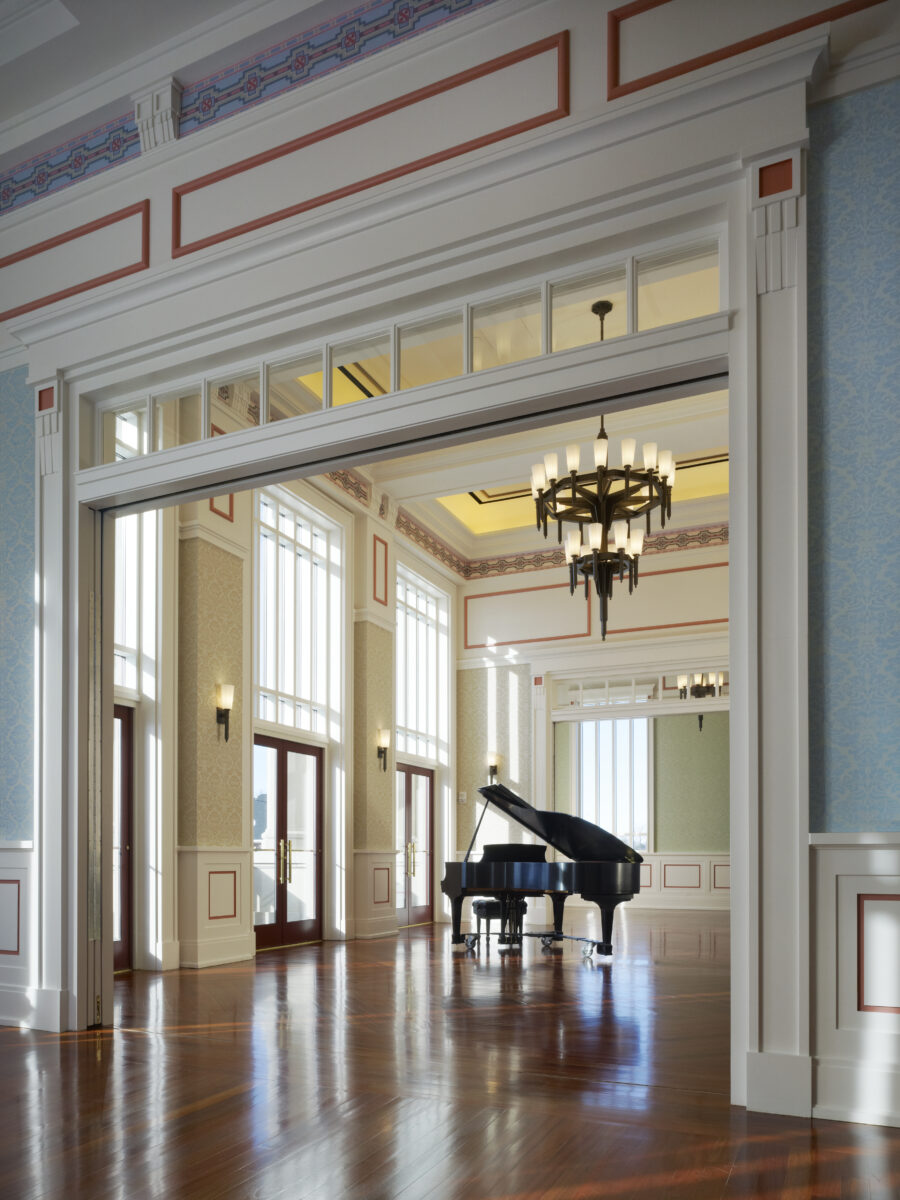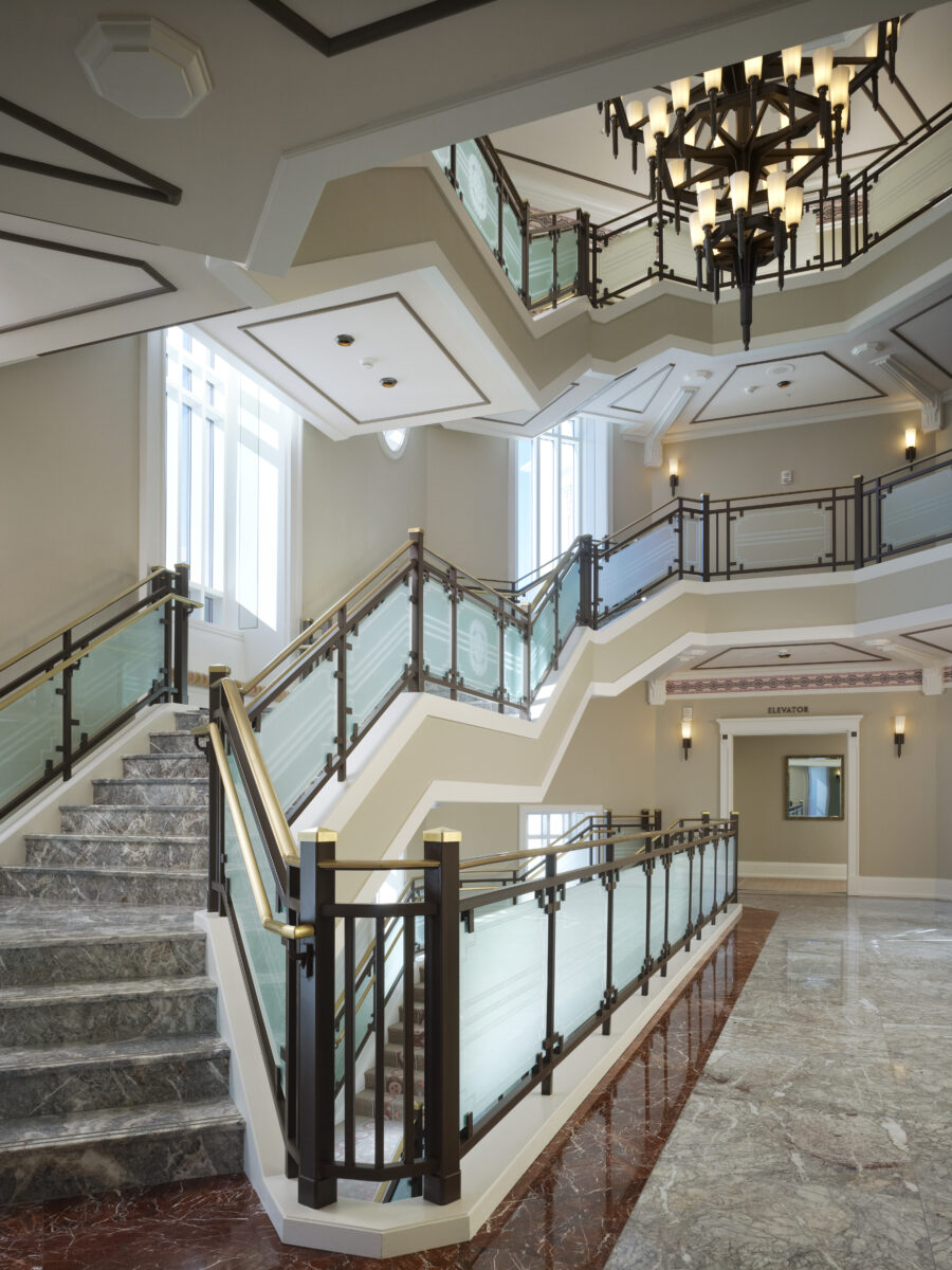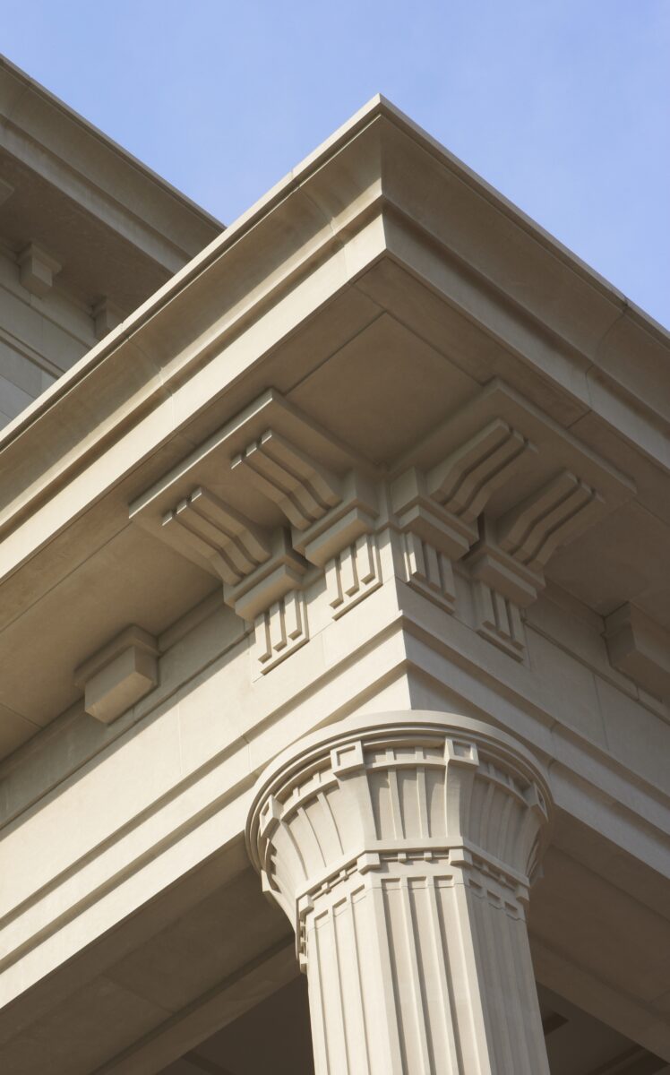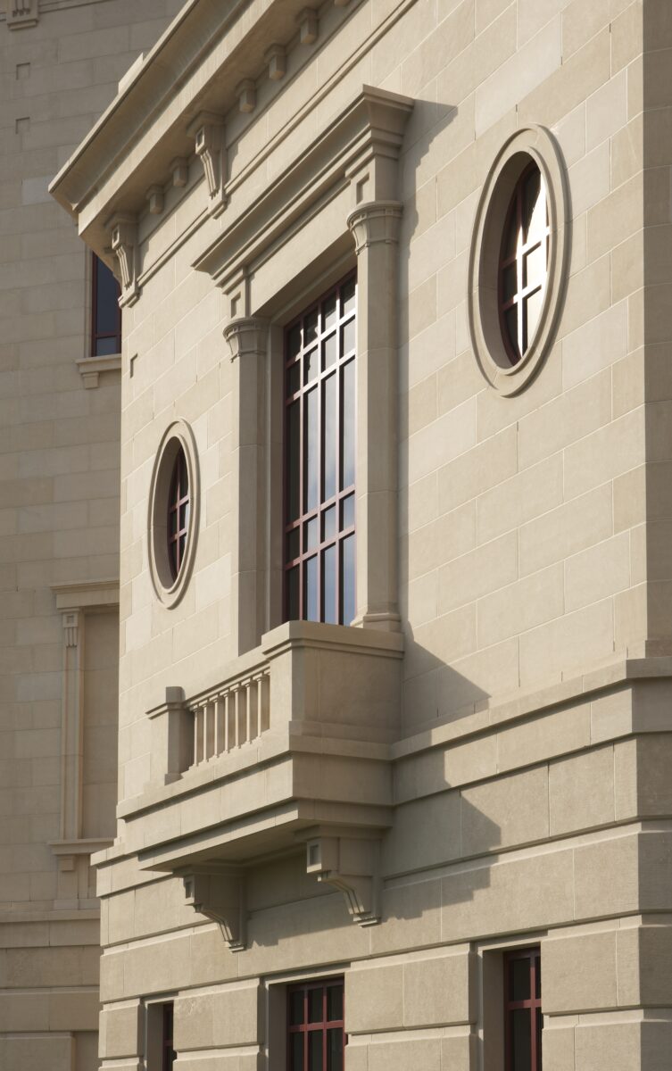 The exterior is clad in Indiana limestone and is detailed, at the request of the client, in a more traditional architectural vocabulary that the design team stylized and refined to make more appropriate to the time in which it was built. Stylized geometric brackets support deep horizontal projecting cornices and all window and door openings are treated with robust ornamental surrounds.