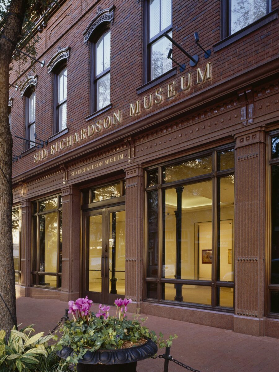 Prior to the renovation, the Sid Richardson Museum had a solid brick facade with a tinted-glass door, set back from the plane of neighboring storefronts. The quickly dated design did not contribute to the streetscape and lacked identity. Our design for the renovation includes the creation of the large storefront windows and a clear glass pair of doors. This new transparency, providing views into the Museum’s Main Lobby and Gift Shop, is a lively addition to Main Street. The Museum now fits much more comfortably with the other storefronts on the block, while its granite pilasters convey the importance of the Museum, and the bronze buffalo details hint at what’s inside.