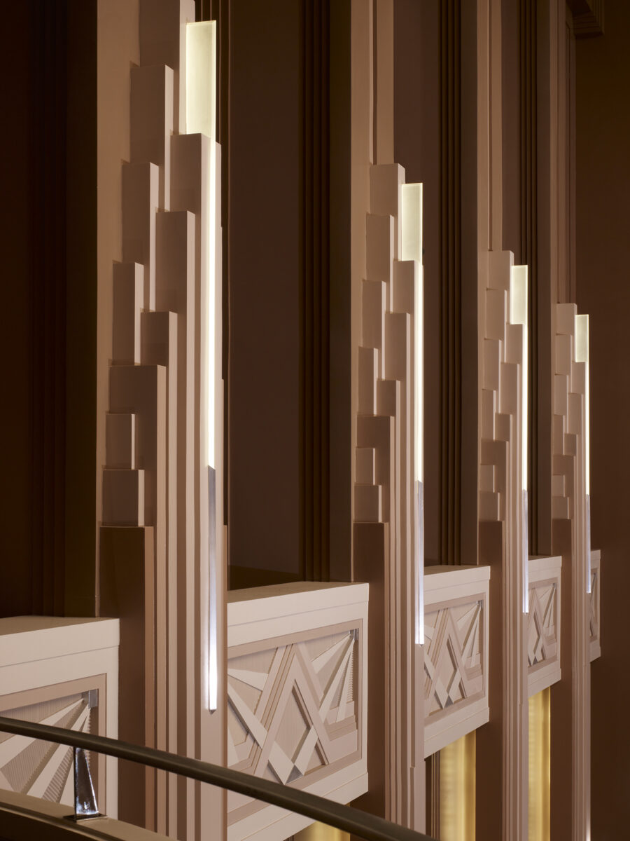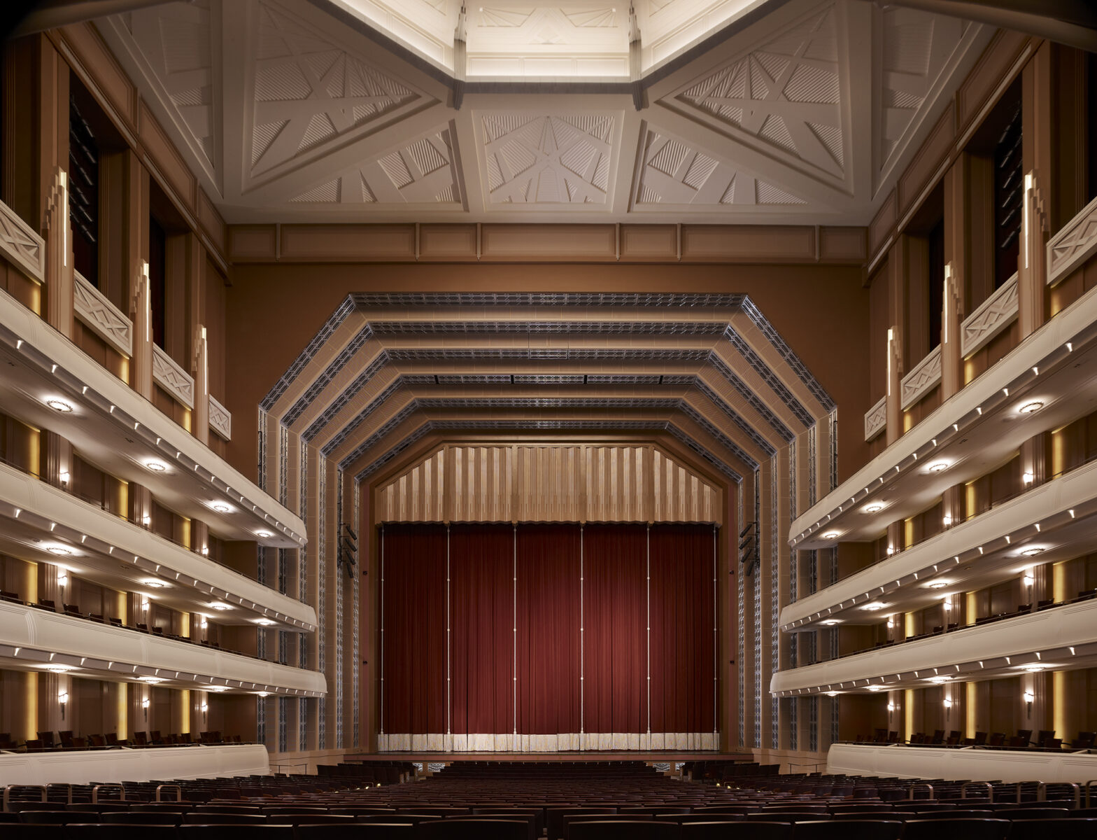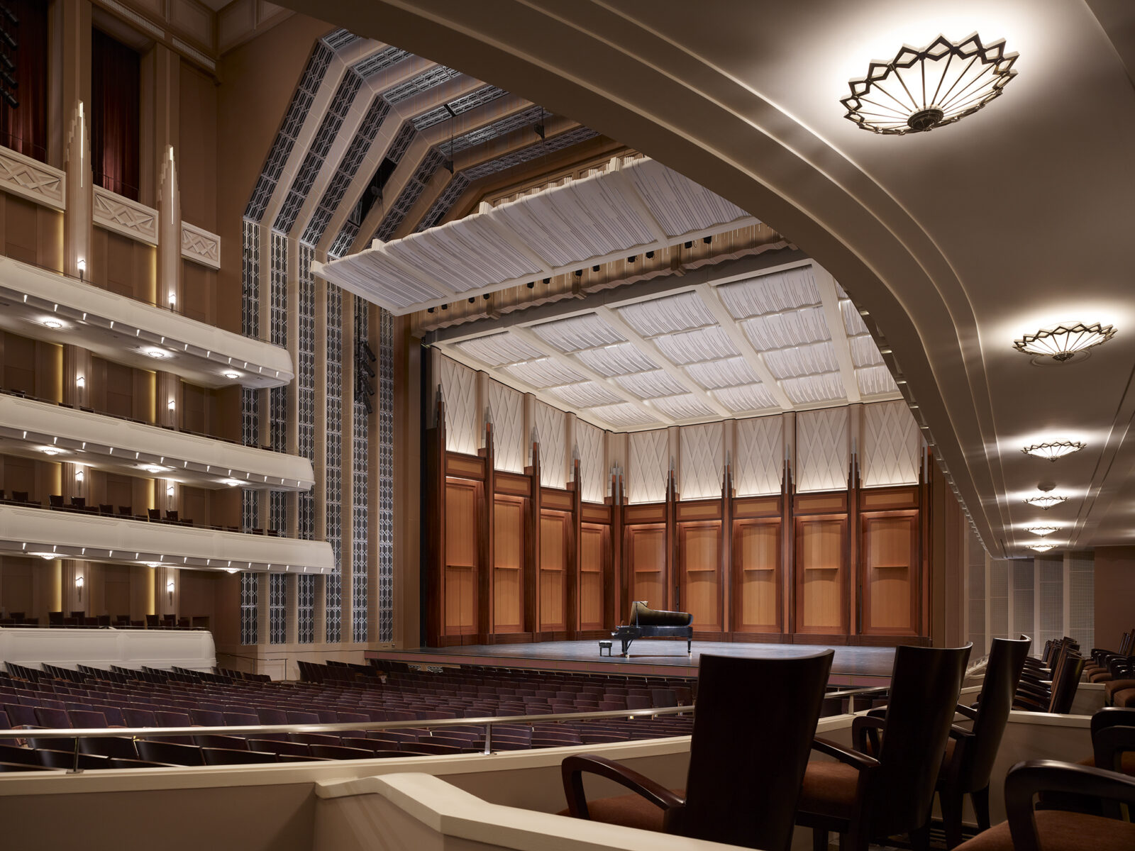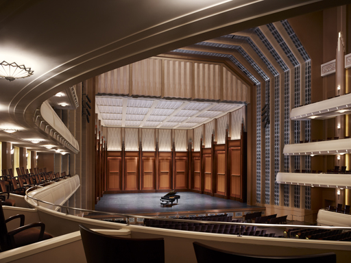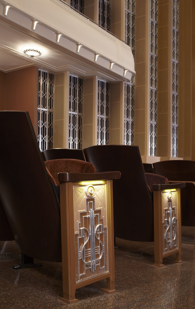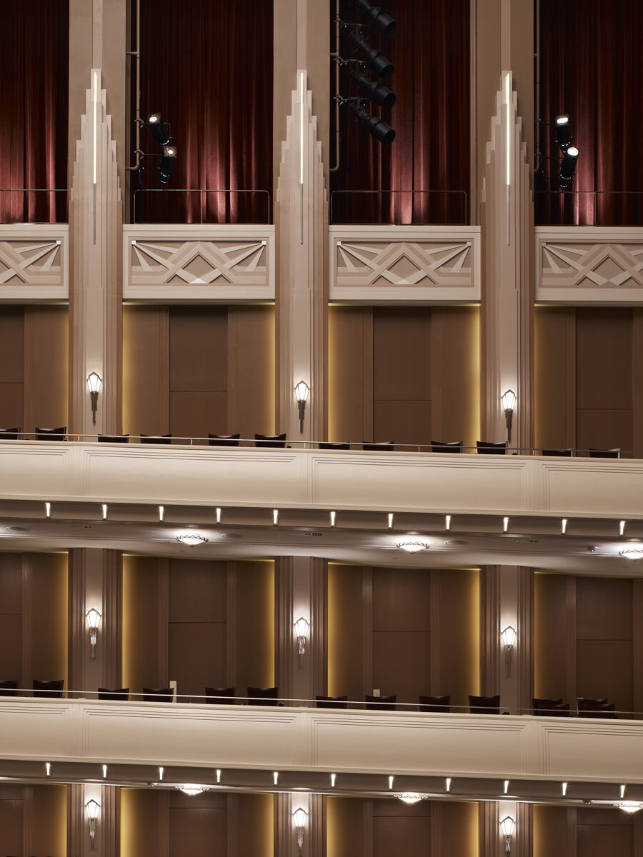 The largest building in The Smith Center complex, Reynolds Hall, totals 232,000 square feet and seats 2,050. The building’s Grand Lobby is clad almost entirely in fine Italian marble and features custom railings detailed with a chevron pattern, a motif that is also found in the design of fixtures and furniture throughout the campus. In addition to the lobbies, there are three, highly ornate spaces for premium level patrons: The Founders’ Room, The Mezzanine Lounge and The Box Tier Foyer.