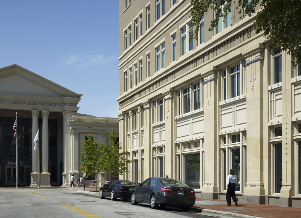 The sixteen-story Carnegie Building anchors half a city block on the edge of the historic Sundance Square in Fort Worth, Texas. A distinctly urban identity fuses easily with elegance typical of Fort Worth’s 19th-century buildings. The building is organized in a classic tripartite, while a carefully considered “plaid” of vertical and horizontal elements emphasizes the towers anchoring the Carnegie’s corners. The center steps back from Third Street, providing a deep sidewalk for future café seating and strengthening the pedestrian character of Fort Worth’s main east-west street. A metal canopy announces the entrance to the building. A step inside reveals a domed lobby with pilasters finished richly in marble and patterned terrazzo providing a signature experience for the downtown.